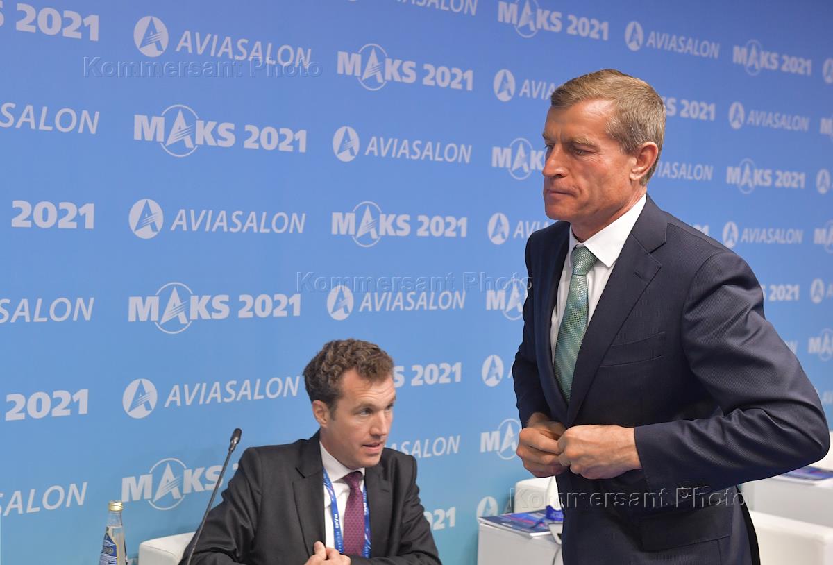 Международный авиационно-космический салон МАКС-2021 на аэродроме в Жуковском. Глава Airbus в Европе Ваутер Ван Верш (справа) и совладелец авиакомпании Air Manas Александр Беловол (слева) во время церемонии подписания договора на оказание услуг по пулингу и ремонту компонентов для самолетов A220 в рамках авиасалона.