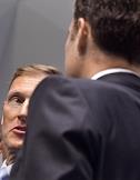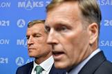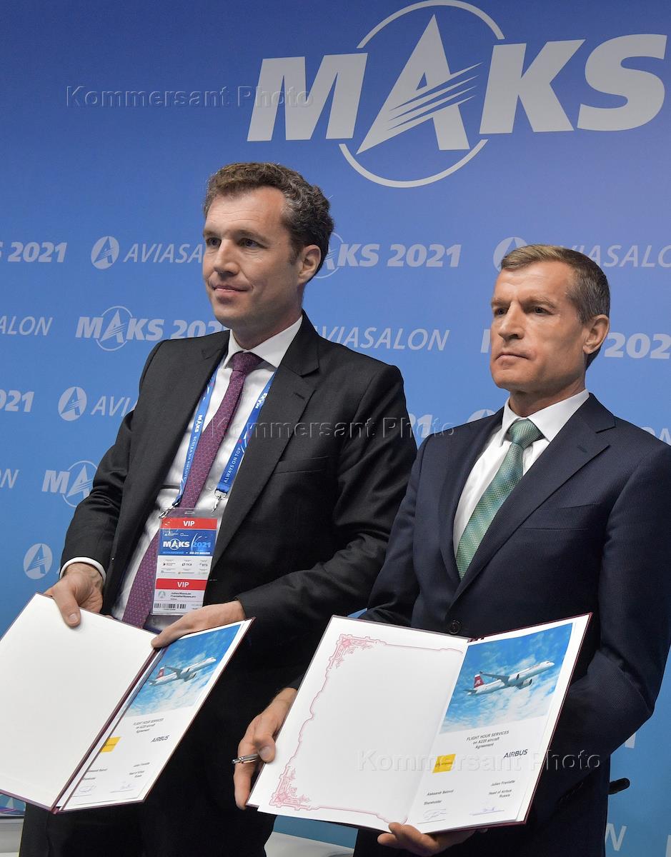 Международный авиационно-космический салон МАКС-2021 на аэродроме в Жуковском. Глава Airbus в Европе Ваутер Ван Верш (слева) и глава Airbus в России Жульен Франьятт (справа) во время церемонии подписания договора с авиакомпанией Air Manas на оказание услуг по пулингу и ремонту компонентов для самолетов A220 в рамках авиасалона.