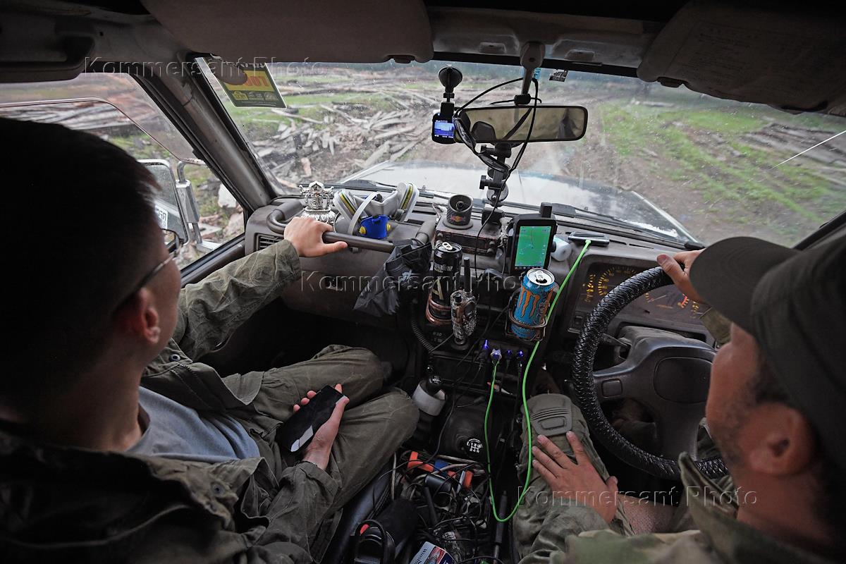 Лесные пожары в Якутии. Участники общественного добровольческого штаба по борьбе с лесными пожарами в автомобили по пути к месту пожара.