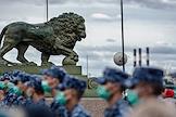 Генеральная репетиция военно-морского парада в честь Дня Военно-морского Флота (ВМФ) России в акватории реки Невы. Сотрудник Росгвардии в оцеплении на набережной во время парада.