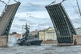 Генеральная репетиция военно-морского парада в честь Дня Военно-морского Флота (ВМФ) России в акватории реки Невы. Ракетный катер "Димитровград" проходит под Дворцовым мостом.