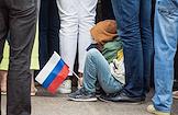 Генеральная репетиция военно-морского парада в честь Дня Военно-морского Флота (ВМФ) России в акватории реки Невы. Жанровая фотография. Ребенок сидит на земле в ожидании начала репетиции.