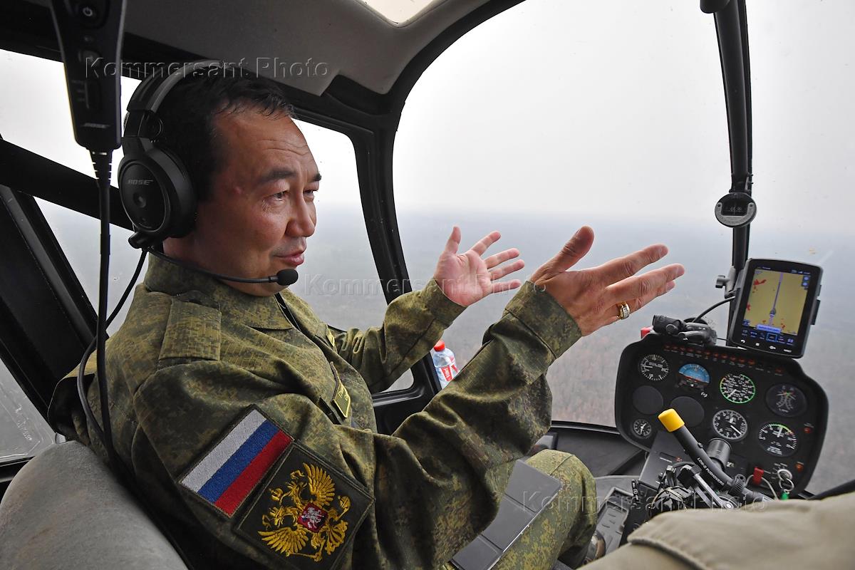 Лесные пожары в Якутии. Глава Республики Саха (Якутия) Айсен Николаев в кабине вертолета во время инспекции тушения пожаров в Горном районе Якутии.