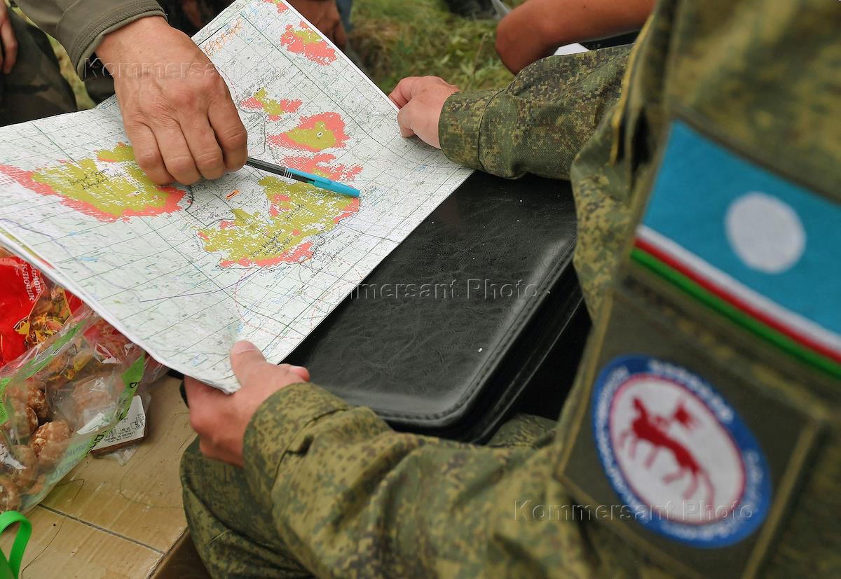 Лесные пожары в Якутии. Кабина вертолета и карта пожаров в Горном районе Якутии.