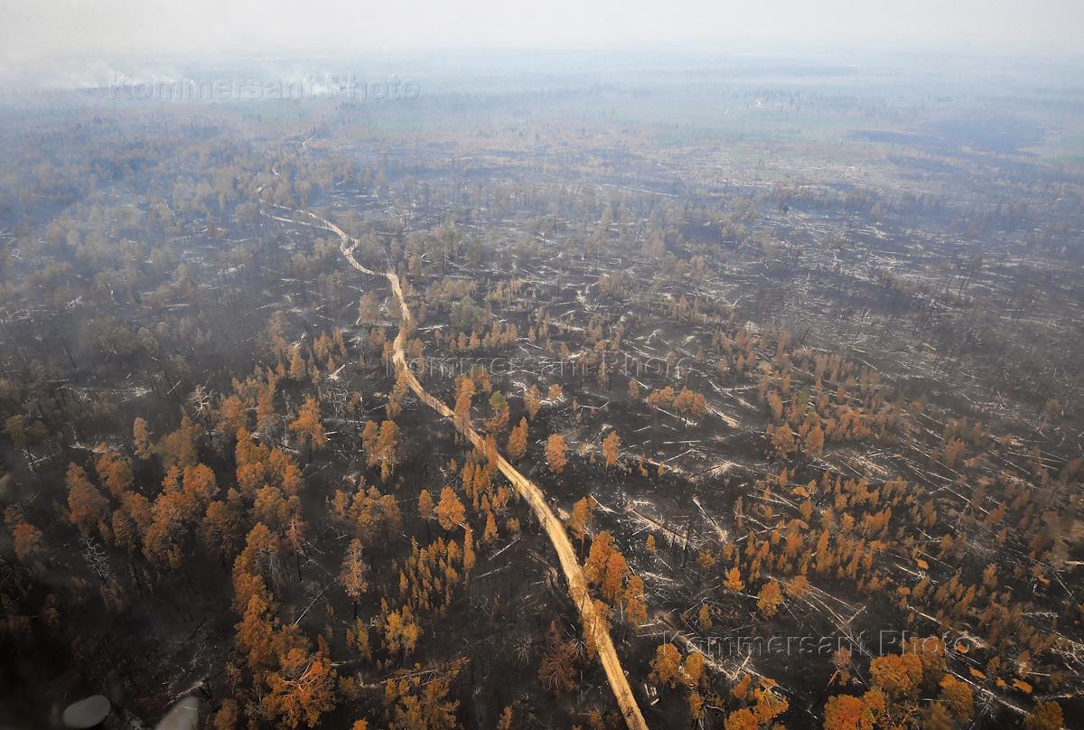 Лесные пожары в Якутии. Вид на горящий лес в Горном районе Якутии из кабины вертолета.