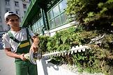 Виды Москвы. Тверская улица. Жанровая фотография. Рабочий подстригает кусты на Тверской площади.