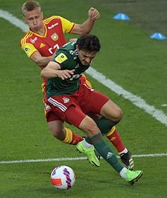 Российская Премьер-Лига (РПЛ). Тинькофф - Чемпионат России по футболу 2021/2022. 1-й тур. Матч между командами "Локомотив" (Москва) — "Арсенал" (Тула) на стадионе "РЖД Арена". Игрок команды "Локомотив" Антон Миранчук (слева) и игрок команды "Арсенал" Игорь Смольников (справа) во время матча.
