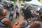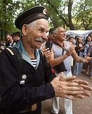Празднование Дня Военно-морского флота (ВМФ) России. народные гуляния в городе. Ветераны ВМФ танцуют на улице.