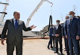 Рабочая поездка председателя России Михаила Мишустина в Сахалинскую область. Причал для судов рыбоперерабатывающего завода "Ясный" холдинга "Гидрострой" в бухте Китовая (поселок Китовый) на южнокурильском острове Итуруп.