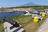 Рабочая поездка председателя России Михаила Мишустина в Сахалинскую область. Причал для судов рыбоперерабатывающего завода "Ясный" холдинга "Гидрострой" в бухте Китовая (поселок Китовый) на южнокурильском острове Итуруп. Старинные пушки, снятые с кораблей, на берегу буъты.