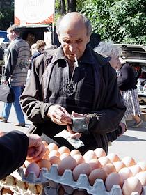 Мужчина покупает куриные яйца на Ростовской областной сельскохозяйственной ярмарке.