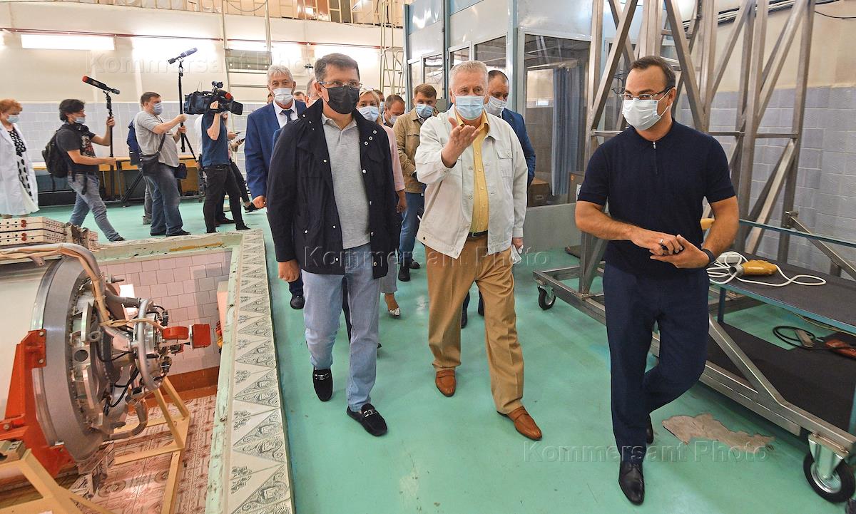 Лидер Либерально-демократической партии России (ЛДПР) Владимир Жириновский (в центре) и председатель комитета Государственной думы России по экономической политике, промышленности, инновационному развитию и предпринимательству Сергей Жигарев (второй слева) во время посещения Научно‑исследовательского института электромеханики (АО "НИИЭМ") в рамках серии предвыборных поездок.
