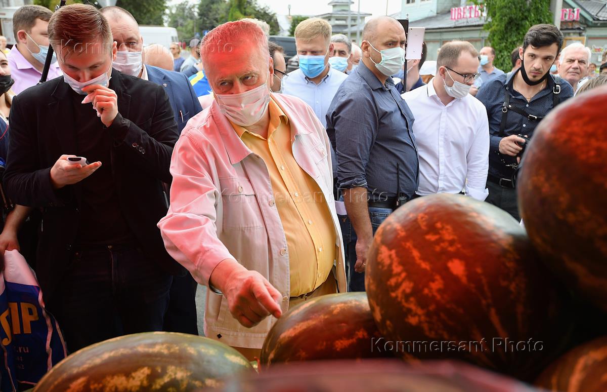 Лидер Либерально-демократической партии России (ЛДПР) Владимир Жириновский посетил продуктовый рынок в городе Истра в рамках серии предвыборных поездок. Жанровая фотография. Продавцы и покупатели на рынке.