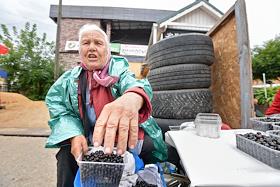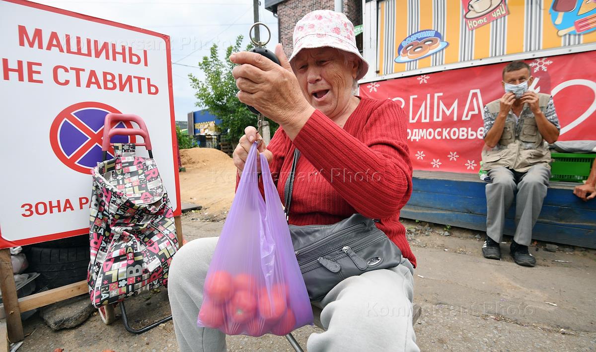 Лидер Либерально-демократической партии России (ЛДПР) Владимир Жириновский посетил продуктовый рынок в городе Истра в рамках серии предвыборных поездок. Жанровая фотография. Продавщица фруктов на рынке.