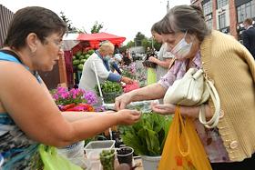 Лидер Либерально-демократической партии России (ЛДПР) Владимир Жириновский посетил продуктовый рынок в городе Истра в рамках серии предвыборных поездок. Жанровая фотография. Продавцы и покупатели на рынке.