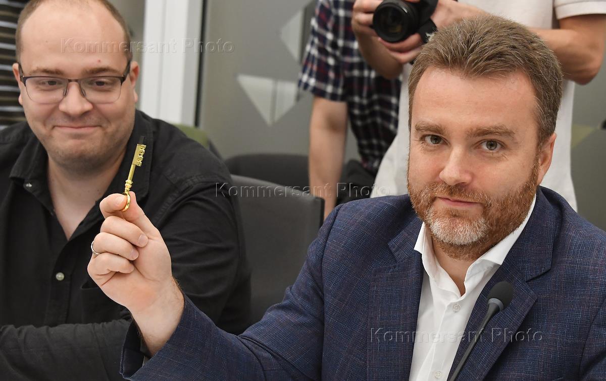 The procedure for splitting the encryption key for testing the remote electronic voting system, which will take place in Moscow on July 29-30 in the Krasnaya Roza business district (DC). Deputy Head of the Moscow Department of Information Technologies (DIT) Artem Kostyrko (right) during the event.