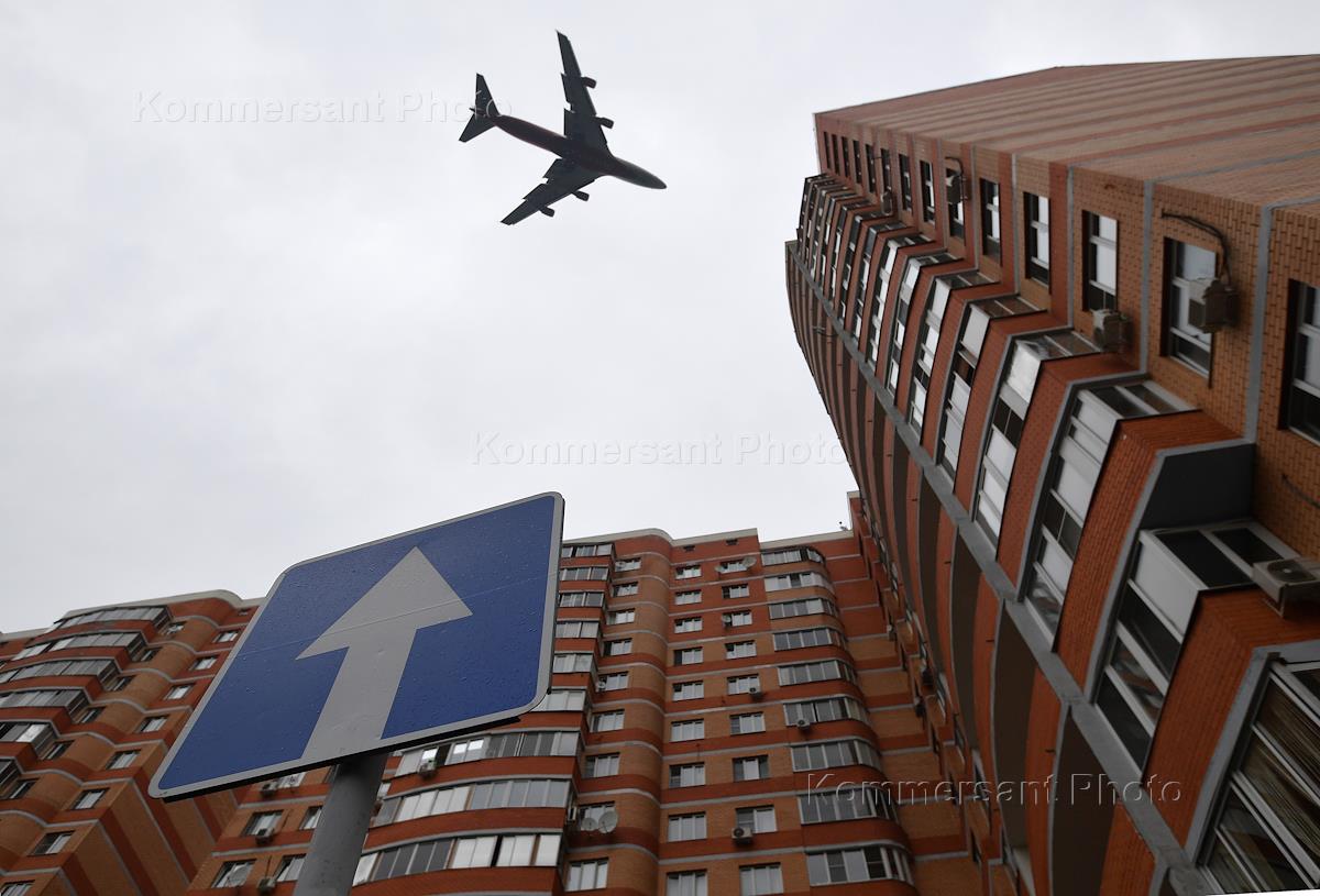 The situation in the Skhodnya microdistrict of the city of Khimki. Local residents claim that they cannot rest from the planes flying over their houses either day or night. Airplane flying over houses.