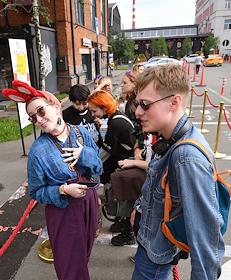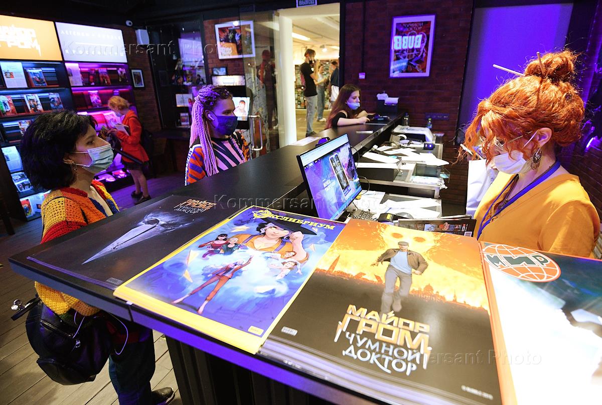 Церемония открытия официального магазина издательства комиксов BUBBLE в пространстве дизайн-завода "Флакон". Жанровая фотография. Посетители в очереди в кассу.