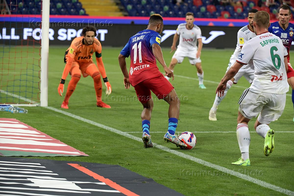 Российская Премьер-Лига (РПЛ). Тинькофф - Чемпионат России по футболу 2021/2022. 1-й тур. Матч между командами ЦСКА (Москва) — "Локомотив" (Москва) на стадионе "ВЭБ Арена". Игрок команды ЦСКА Чидера Эджуке (в центре) во время матча.