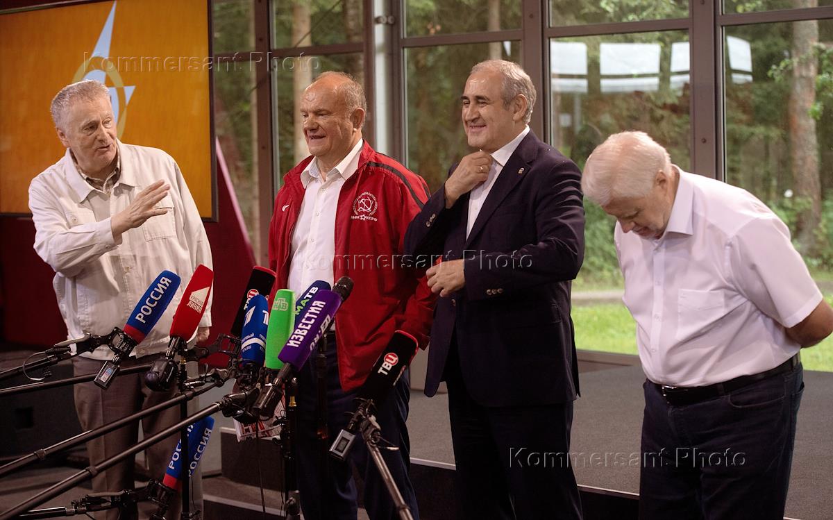 Всероссийский молодежный образовательный форум "Территория Смыслов" на территории мастерской управления "Сенеж". Слева направо: лидер КПРФ, член комитета Государственной думы (ГД) России по делам Содружества Независимых Государств, евразийской интеграции и связям с соотечественниками Геннадий Зюганов, лидер Либерально-демократической партии России (ЛДПР) Владимир Жириновский, руководитель фракции партии "Единая Россия" в ГД России Сергей Неверов и председатель партии "Справедливая Россия – Патриоты - За Правду", руководитель фракции "Справедливая Россия" в ГД России Сергей Миронов во время встречи участников с лидерами фракций ГД России в рамках форума.