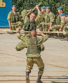 Торжественные мероприятия, посвященные празднованию 91-й годовщины образования Воздушно-десантных войск (ВДВ). Военно-спортивный праздник на "Кургане Славы" полигона "Алабино". Показательные выступления десантников по боевому искусству.