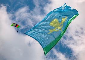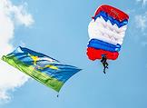 Торжественные мероприятия, посвященные празднованию 91-й годовщины образования Воздушно-десантных войск (ВДВ). Военно-спортивный праздник на "Кургане Славы" полигона "Алабино". Показательные выступления парашютистов.