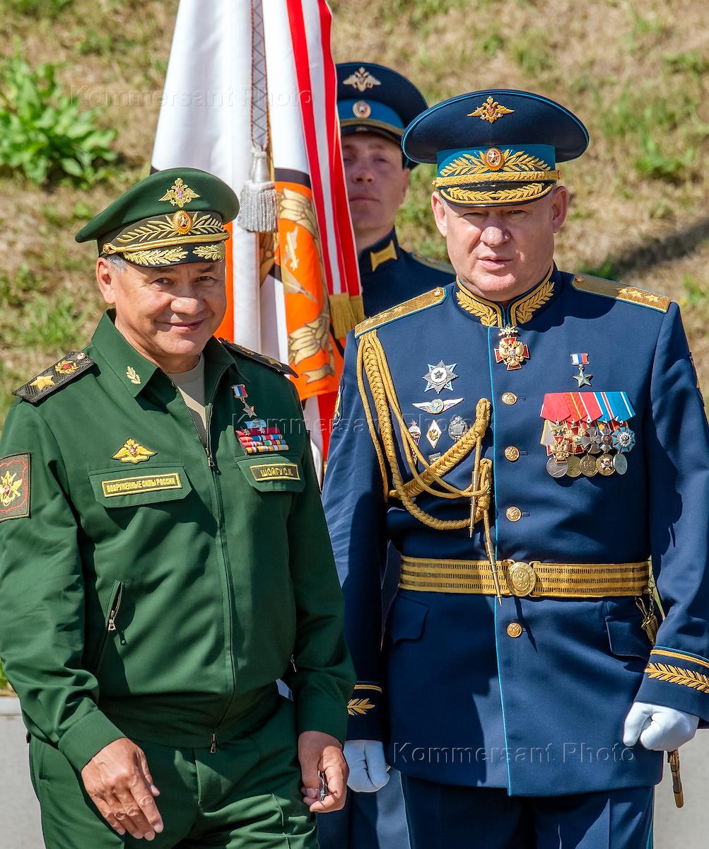 Торжественные мероприятия, посвященные празднованию 91-й годовщины образования Воздушно-десантных войск (ВДВ). Военно-спортивный праздник на "Кургане Славы" полигона "Алабино". Министр обороны России Сергей Шойгу (слева) и командующий Воздушно-десантными войсками (ВДВ) России Андрей Сердюков (справа) во время мероприятий.