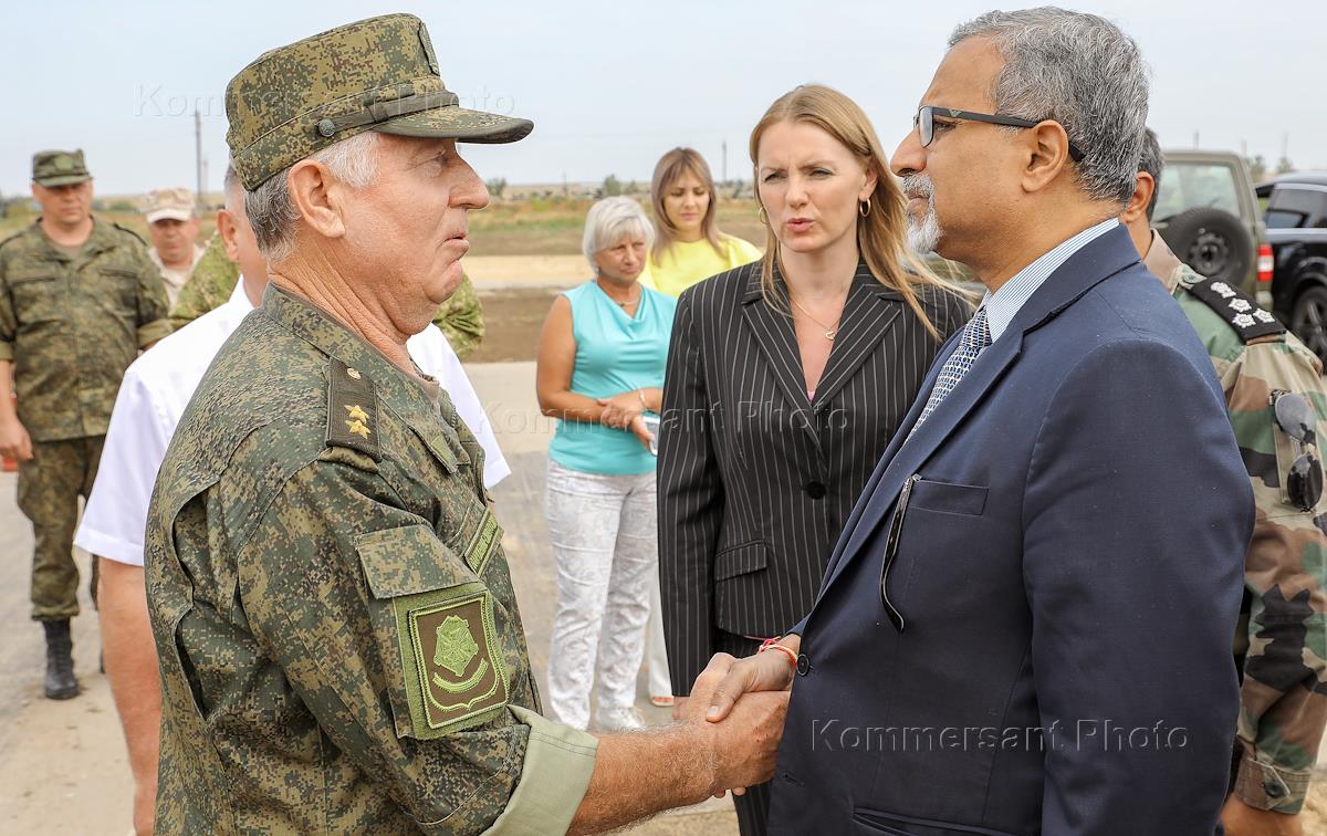 XII совместные российско-индийские учения ИНДРА-2021. Торжественная церемония открытия учений на плацу военного полигона Прудбой. Посол Индии в России Венкатеш Варма (справа) и заместитель командующего 8-ой общевойсковой армии генерал-лейтенант Арутюн Дальбинян (слева) во время церемония открытия.