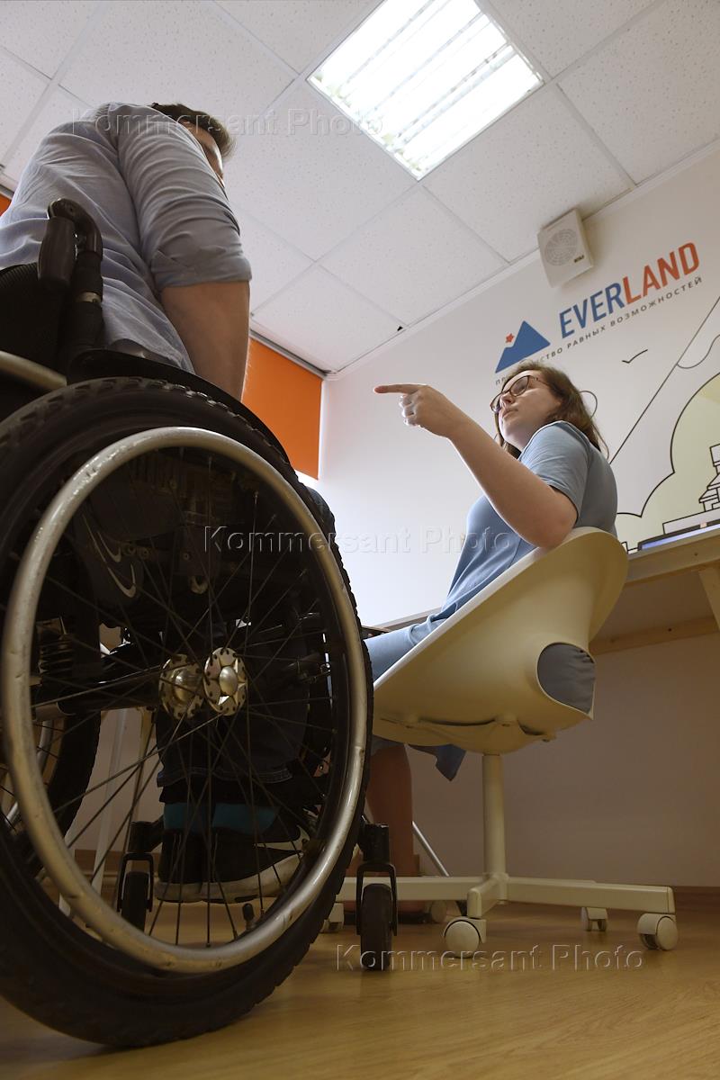 Первый инклюзивный коворкинг Автономной некоммерческой организацией (АНО) "Пространство равных возможностей", созданный учредителями Everland, в бизнес-центре "Виктория Плаза" на Бауманской. Сооснователь Everland, руководитель АНО "Пространство равных возможностей", куратор направления Консалтинг Игорь Новиков во время интервью.