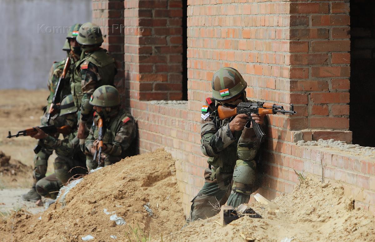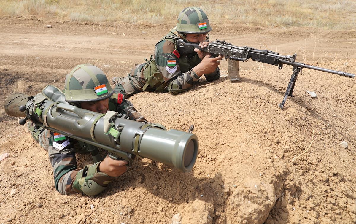 XII совместные российско-индийские учения ИНДРА-2021 на военном полигоне Прудбой. Индийские военные во время стрельбы на полигоне.