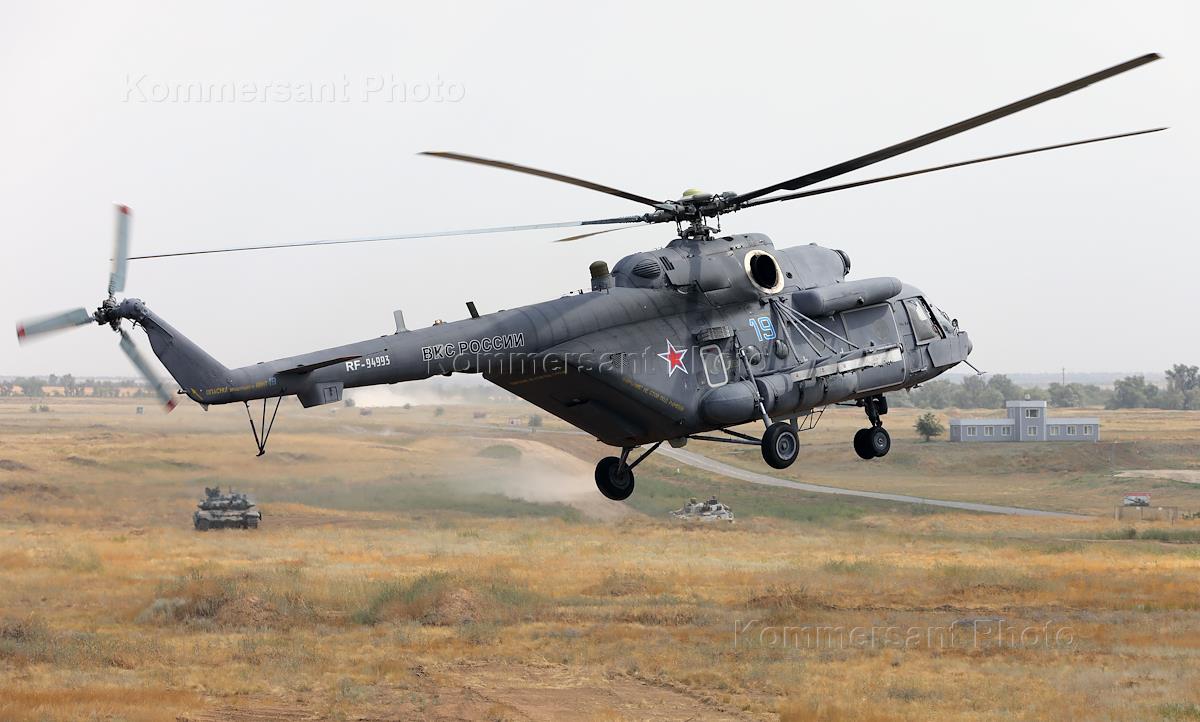 XII совместные российско-индийские учения ИНДРА-2021 на военном полигоне Прудбой. Вертолет Вооруженных Сил России в небе над полигоном.