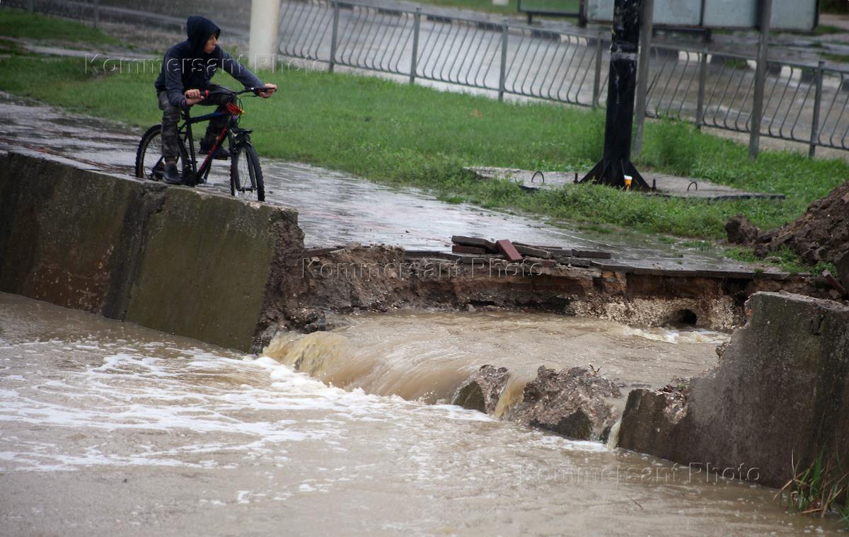 Последствие наводнения в городе. Жанровая фотография. Размытый водой тротуар.