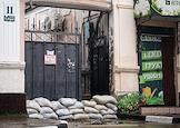 Последствие наводнения в городе. Жанровая фотография. Мешки с песком у ворот жилого дома.