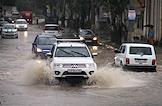 Последствие наводнения в городе. Жанровая фотография. Автомобили едут по воде.