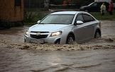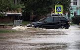 Последствие наводнения в городе. Жанровая фотография. Автомобиль едет по воде.