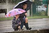 Последствие наводнения в городе. Жанровая фотография. Дети под зонтом на улице.