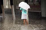 Последствие наводнения в городе. Жанровая фотография. Женщина по зонтом идет по воде.