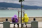 Виды Новороссийска после объявления штормового предупреждения. Жанровая фотография. Отдыхающие в плащах-дождевиках на набережной города.