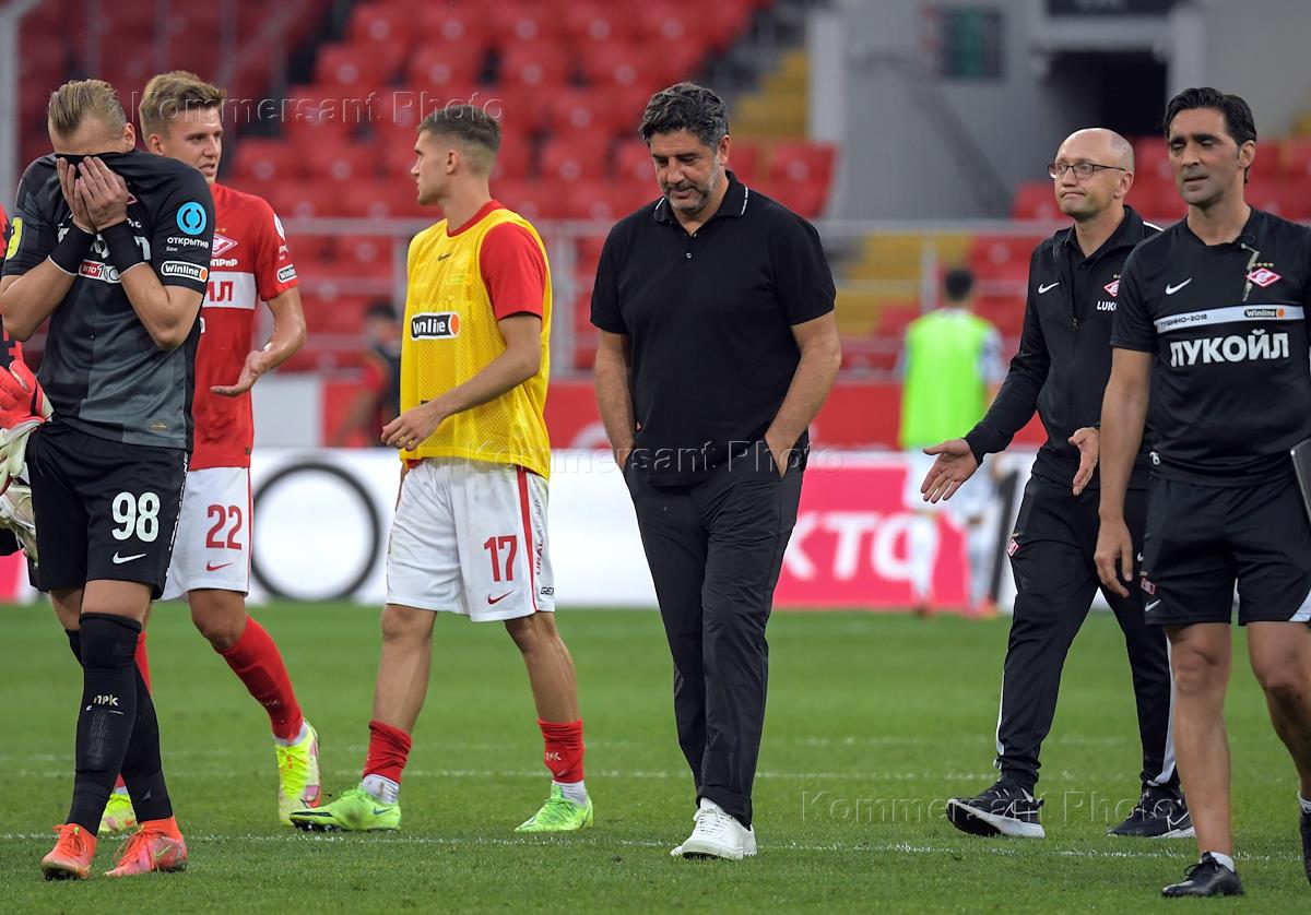 Российская Премьер-Лига (РПЛ). Тинькофф - Чемпионат России по футболу 2021/2022. 4-й тур. Матч между командами "Спартак" (Москва)- "Урал" (Екатеринбург) на стадионе "Открытие Арена". Главный тренер команды "Спартак" Руй Витория (в центре) после матча.
