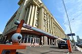 Здание Федеральной антимонопольной службы (ФАС) России в Уланском переулке. Жанровая фотография. Шлагбаум на въезде на территорию ФАС России.
