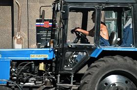 Здание Федеральной антимонопольной службы (ФАС) России в Уланском переулке. Жанровая фотография. Трактор коммунальных служб города марки "Беларусь" у здания.