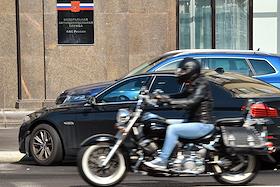 Здание Федеральной антимонопольной службы России в Уланском переулке. Жанровая фотография. Припаркованные автомобили и мотоциклист у здания.
