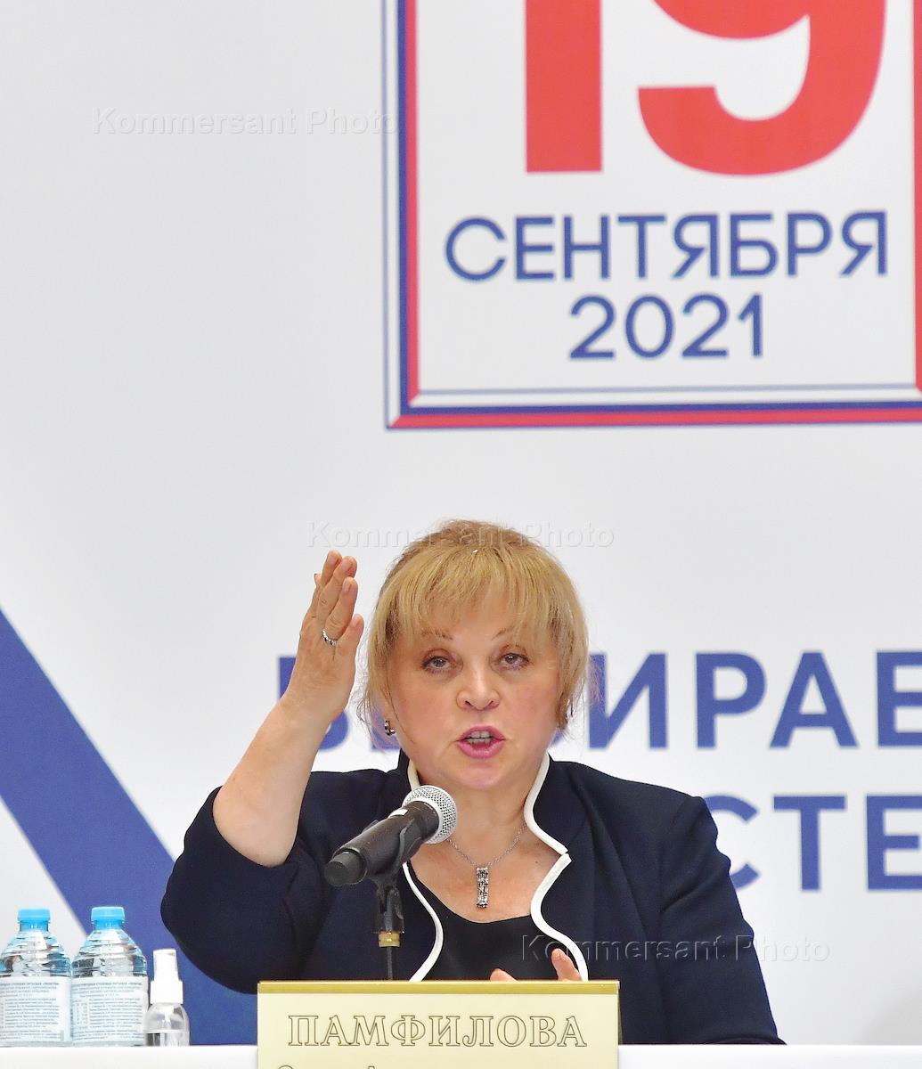 Жеребьевка в Центральной избирательной комиссии (ЦИК) России по определению мест партий в избирательном бюллетене на выборах депутатов Государственной думы России 19 сентября 2021 года. Председатель ЦИК России Элла Памфилова во время жеребьевки.