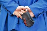 Жеребьевка в Центральной избирательной комиссии (ЦИК) России по определению мест партий в избирательном бюллетене на выборах депутатов Государственной думы России 19 сентября 2021 года. Жанровая фотография. Защитная маска с эмблемой партии "Коммунисты России" в руке участника жеребьевки.