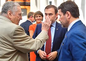 Жеребьевка в Центральной избирательной комиссии (ЦИК) России по определению мест партий в избирательном бюллетене на выборах депутатов Государственной думы России 19 сентября 2021 года. Лидер ЛДПР Владимир Жириновский (слева), первый заместитель председателя ЦК КПРФ Юрий Афонин (в центре) и заместитель председателя комитета Государственной думы России по информационной политике, информационным технологиям и связи, член КПРФ Александр Ющенко (справа) перед началом жеребьевки.