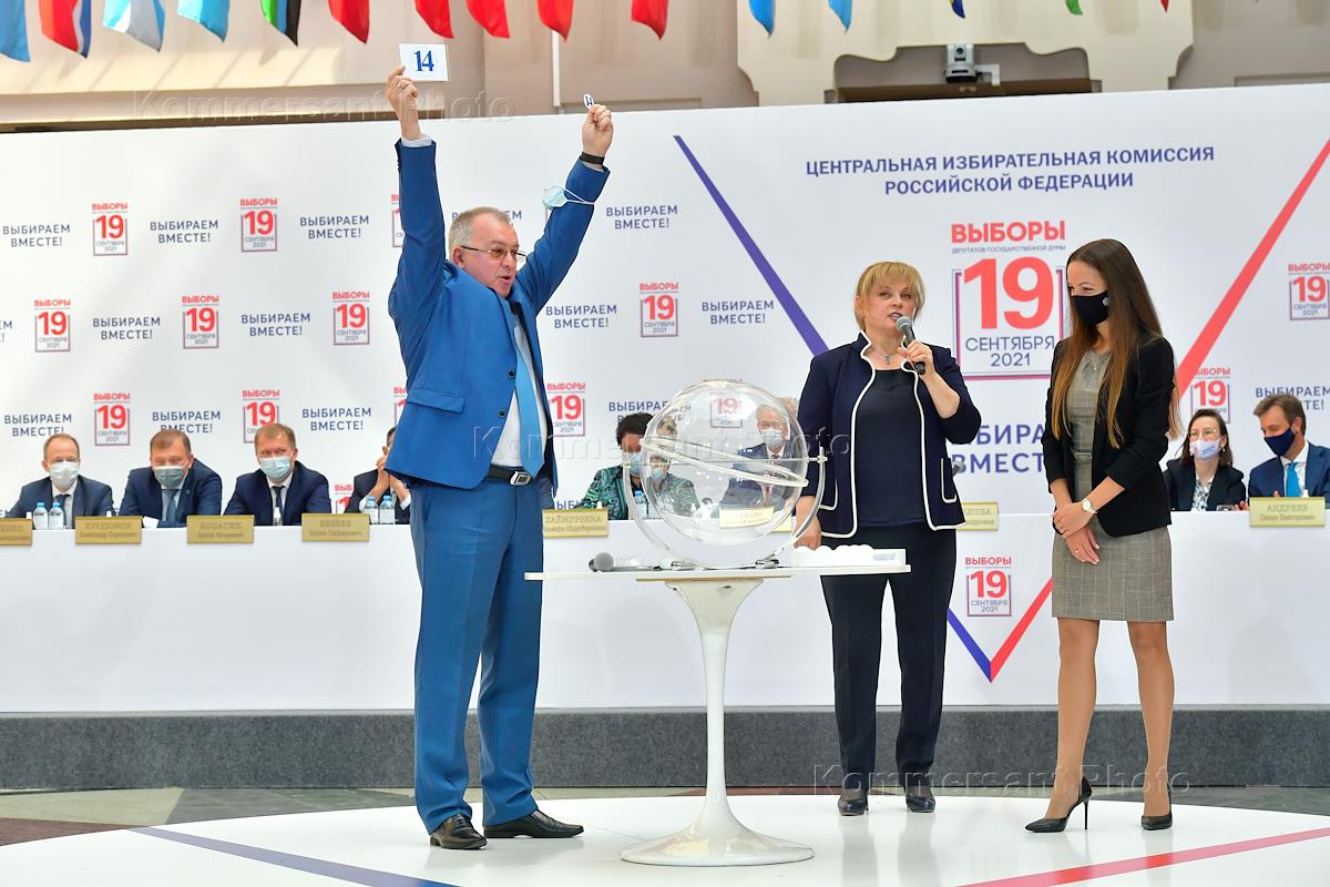 Жеребьевка в Центральной избирательной комиссии (ЦИК) России по определению мест партий в избирательном бюллетене на выборах депутатов Государственной думы России 19 сентября 2021 года. Кандидат от "Партии роста" Сергей Капчук (справа) во время жеребьевки.