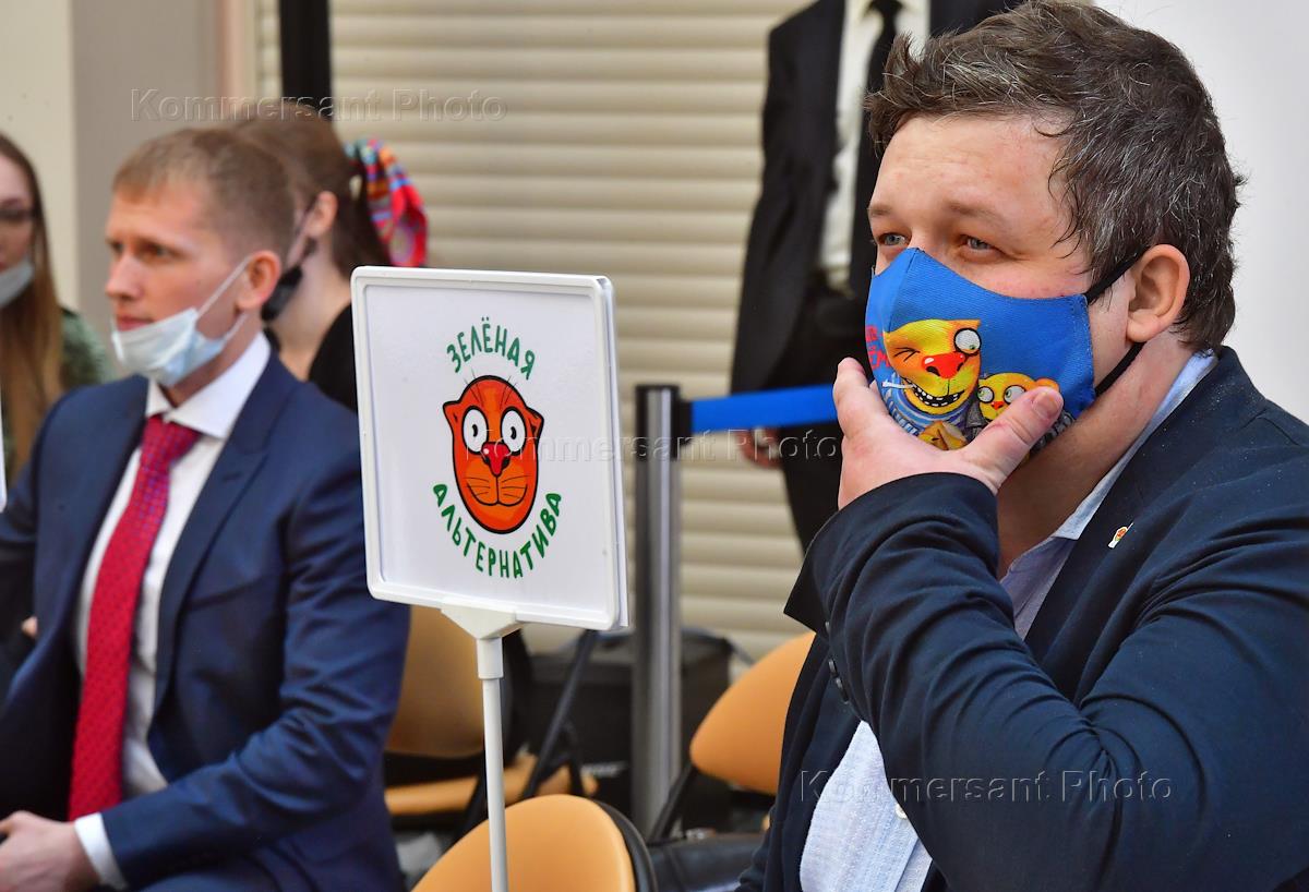 Жеребьевка в Центральной избирательной комиссии (ЦИК) России по определению мест партий в избирательном бюллетене на выборах депутатов Государственной думы России 19 сентября 2021 года. Председатель Российской экологической партии "Зеленые" Андрей Нагибин (справа) во время жеребьевки.