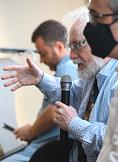 Встреча представителей Общественного штаба по наблюдению за выборами в столице и разработчиков системы дистанционного электронного голосования (ДЭГ) с кандидатами в депутаты Государственной Думы VIII созыва в Деловом квартале "Красная Роза". Кандидат в депутаты ГД России, пенсионер Иван Кульнев во время встречи.