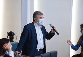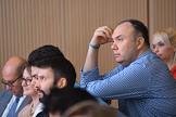 Встреча представителей Общественного штаба по наблюдению за выборами в столице и разработчиков системы дистанционного электронного голосования (ДЭГ) с кандидатами в депутаты Государственной Думы VIII созыва в Деловом квартале "Красная Роза". Член Общественной палаты города Москвы, первый заместитель исполнительного директора Ассоциации Менеджеров Вадим Ковалев во время встречи.