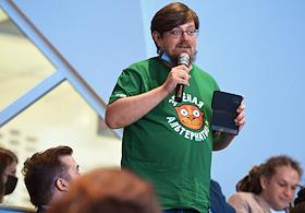 Встреча представителей Общественного штаба по наблюдению за выборами в столице и разработчиков системы дистанционного электронного голосования (ДЭГ) с кандидатами в депутаты Государственной Думы VIII созыва в Деловом квартале "Красная Роза". Эколог, кандидат от партии "Зеленая Альтернатива" Анатолий Баташев.